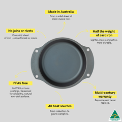 • Naturally non-stick with seasoning — no PFAS, no PTFE, no nasties.