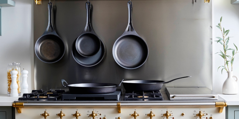 Cast iron is typically made by pouring molten iron into moulds, creating a thick pan with excellent heat retention, conductivity and lasting durability.
