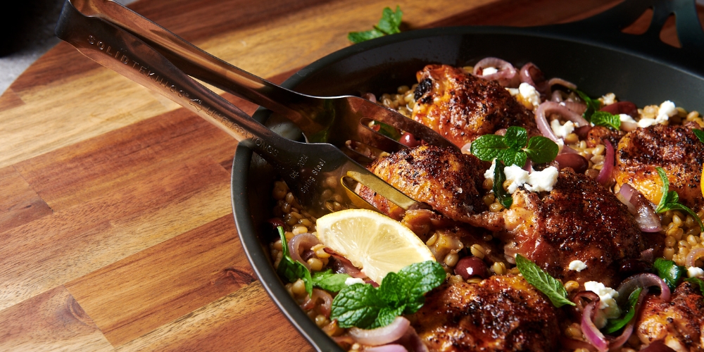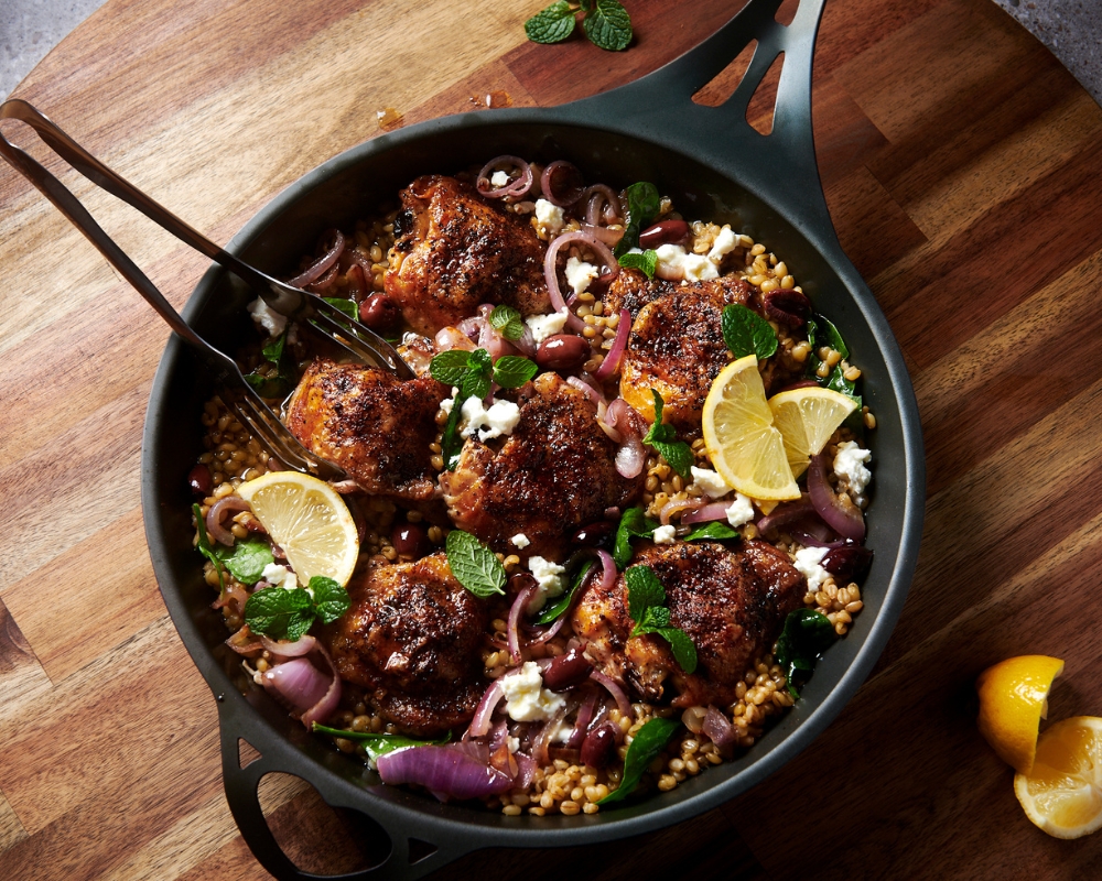 A hearty one-pan meal that’s bursting with bright Mediterranean flavour and perfect for busy week nights. Tender chicken, nutty farro, and olives come together in a lemony broth, all cooked to perfection in a single pan.