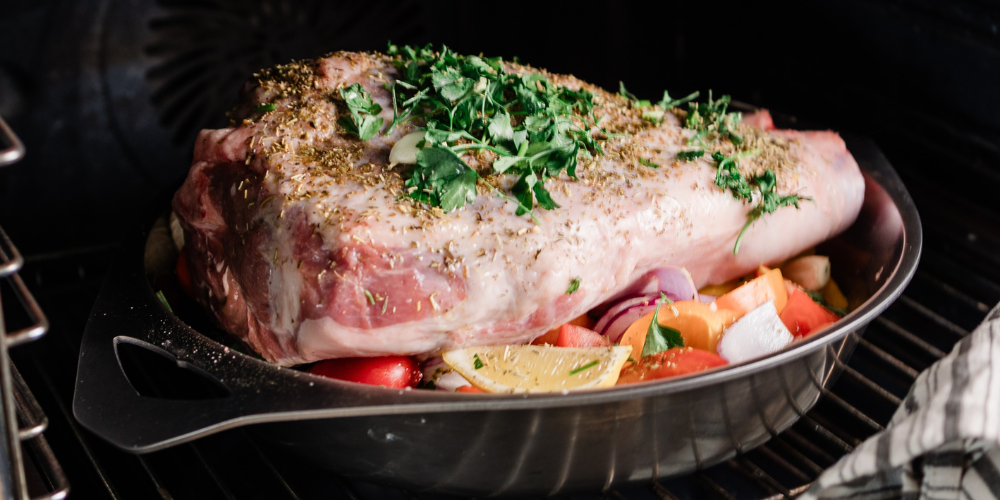 Layered with potatoes, tomatoes, red capsicum and garlic, the lamb roasts gently in its own juices until tender and falling off the bone. The generous depth of our deep pan makes it ideal for this kind of one-pan meal, holding everything together while delivering rich flavour and even cooking.