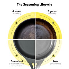 Your AUS-ION pan comes naturally seasoned with pure rice bran oil: no synthetic coatings here! Surface variations are completely normal, even when your pan first arrives. Don’t worry—this won’t affect performance. With every cook, your pan’s seasoning will evolve, creating a surface that’s uniquely yours.