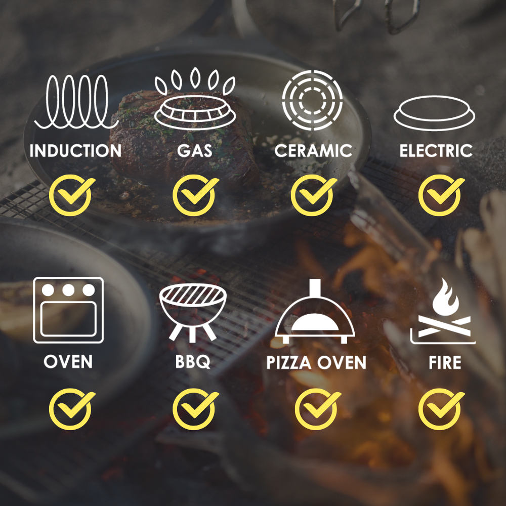 Induction & Fire Ready – Performs on all stovetops (yes, including induction), ovens, BBQs and open flames.