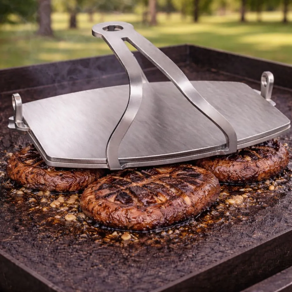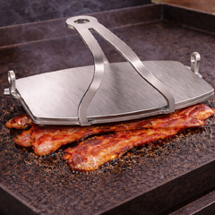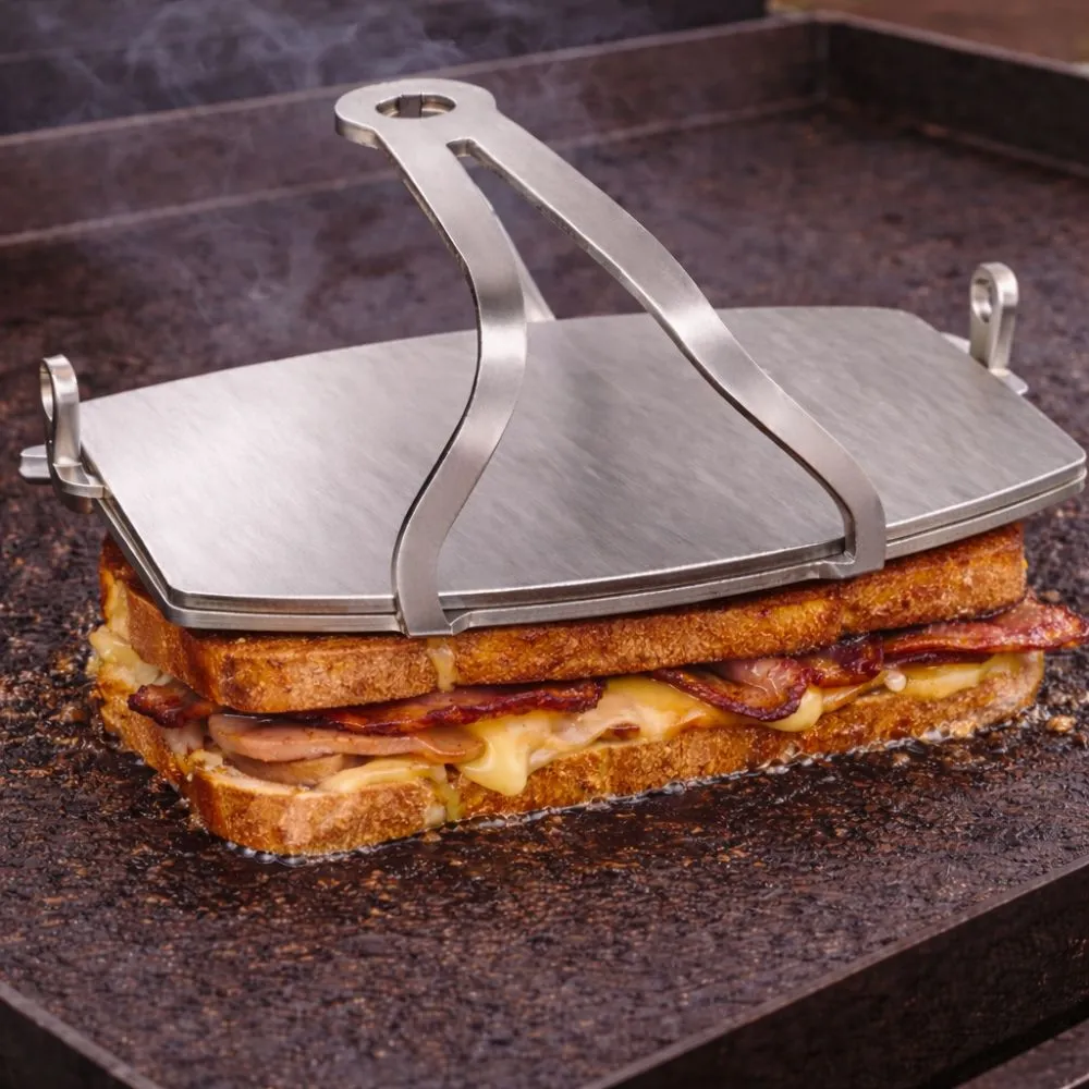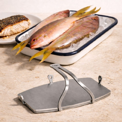 The Fish Press features a wide, low-profile shape that suits fish fillets particularly well, distributing weight evenly across the surface without digging in.