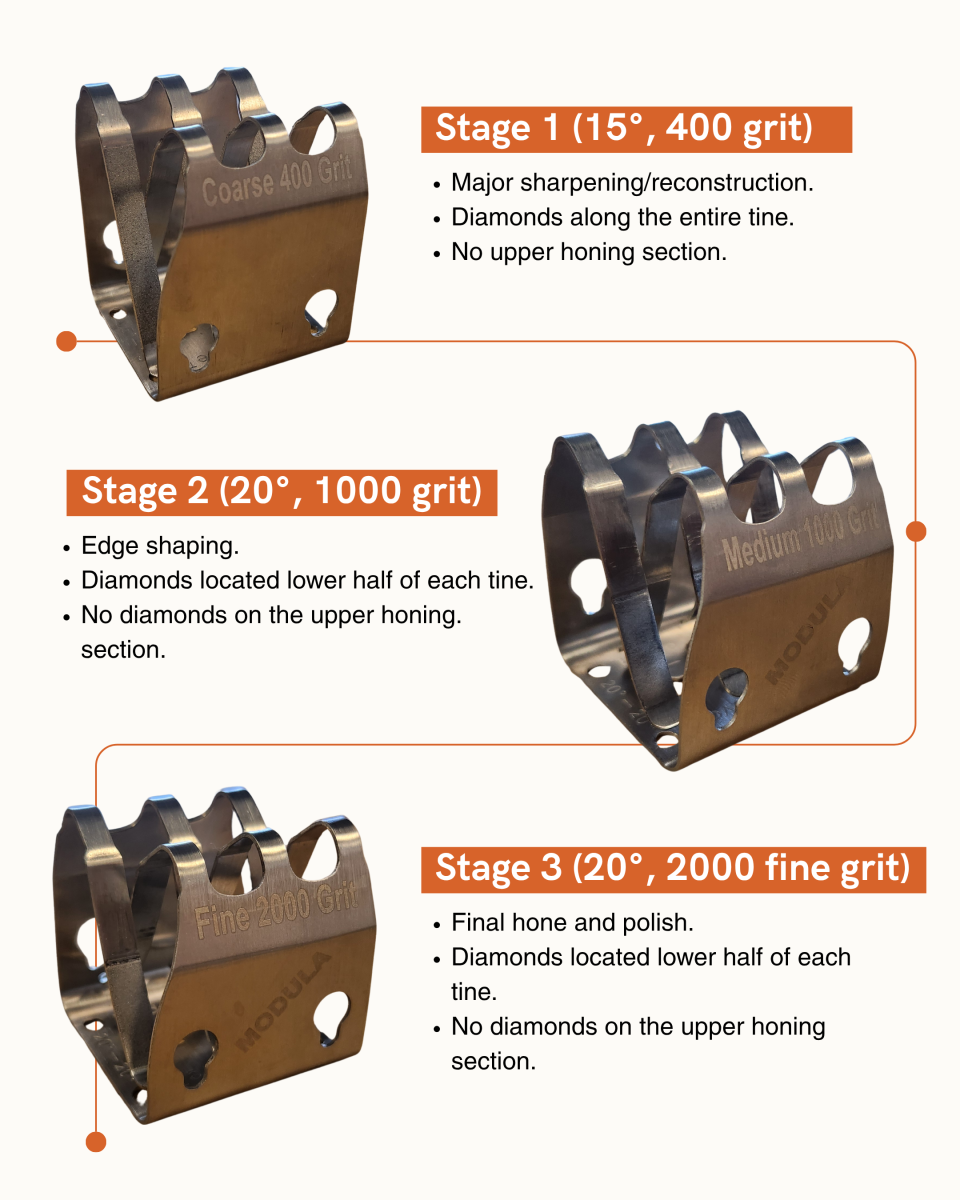 Made from spring steel with a diamond coating, the flexible fingers of our Modüla™ Sharpener are engineered to precisely 20°, and give the ideal edge for all of your everyday cutting and slicing needs.