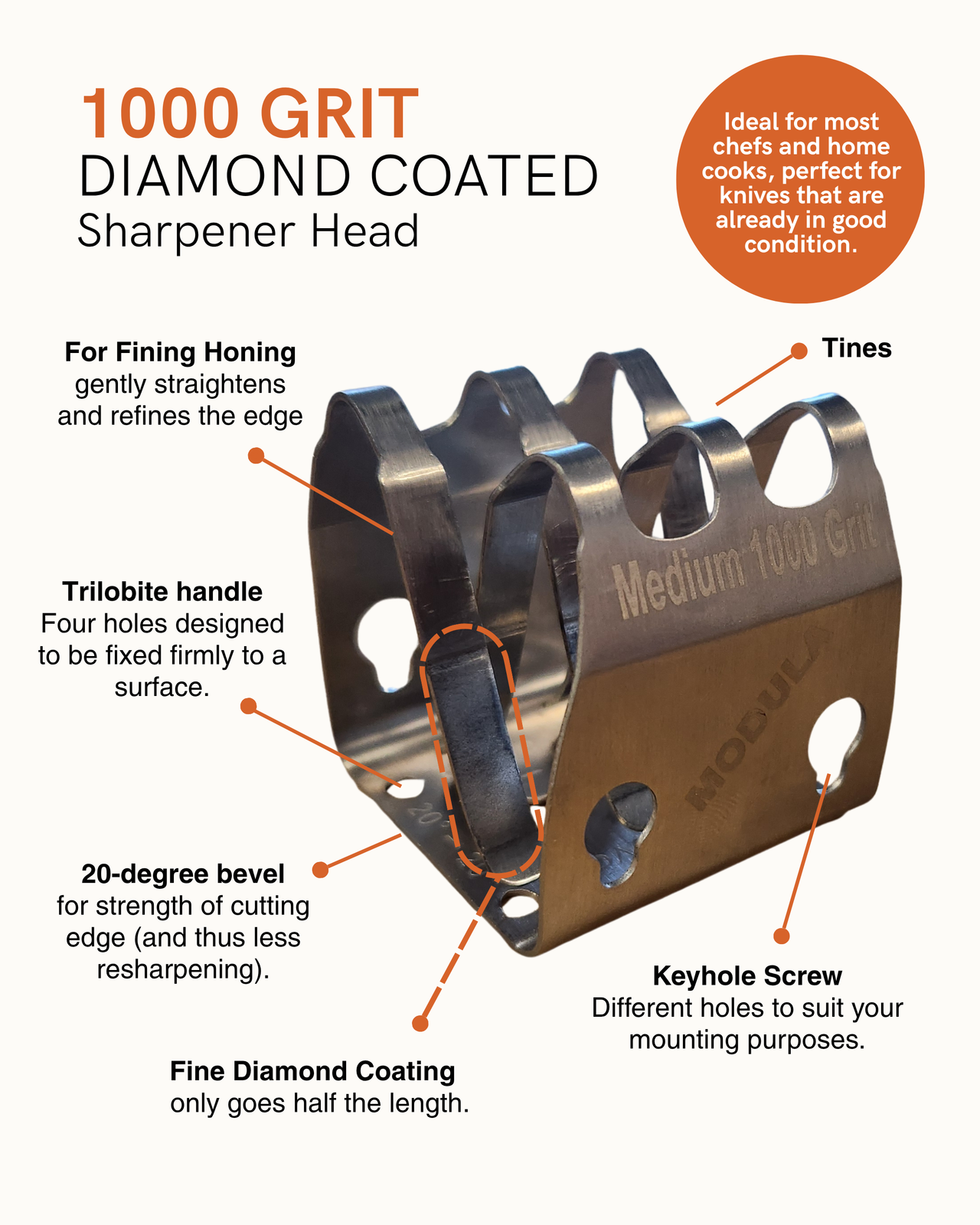 Made from spring steel with a diamond coating, the flexible fingers of our Modüla™ Sharpener are engineered to precisely 20°, and give the ideal edge for all of your everyday cutting and slicing needs.