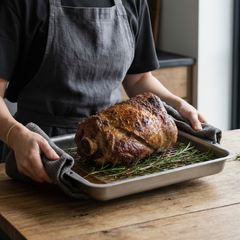 Designed to nest perfectly inside both our nöni™ Stainless Roasting Pan and AUS-ION™ Roasting Pan, this solid stainless rack lifts food for better airflow, cleaner pan juices, and proper browning.